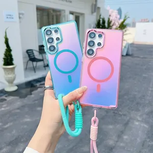 เคสกันกระแทกแม่เหล็กแฟชั่นสุดหรูสายคล้องเลเซอร์ไล่ระดับสีสำหรับซัมซุงกาแล็คซี่ S25 S23 S24ขนาดใหญ่พิเศษขอบ S25
